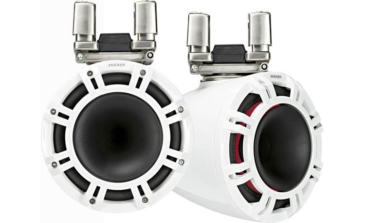 Overview: The Kicker KMTC94W wake tower speakers provide great looks and next-level sound quality for your boat. These 4 ohm, 2-way speaker pods include a 9" polypropylene woofer with a santoprene surround and a 1" titanium dome compression driver incorporating Kicker's Tractrix High-Frequency Horn Design. Both drivers are housed in a UV-resistant polymer enclosure that meets or exceeds ASTM standards for UV and salt/fog exposure. These include a 200 hour salt/fog test and a 400 hour accelerated UV test. The KMTC94W speakers can handle 300 watts of RMS power and 600 watts Peak power.