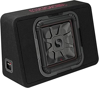 Overview: The TL7T122 Truck Enclosure features a single square 12" Solo-Baric L7T subwoofer (dual 4Ω voice coils wired to present a 2Ω load) mounted in a sealed wedge enclosure designed to mount behind truck seats or other locations where space is a premium. Built with thick MDF and covered in stylish black carpet, the Kicker subwoofer enclosure can handle high power while taking up minimal space.