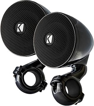 Mounting: Designed for mounting on ATV and motorcycle handlebars (non-fairing), the 47PSMB32 speakers include a pre-installed mounting arm and clamp. Two sizes of rubber shims allow the speakers to be mounted to handlebars 7/8", 1", and 1-1/4" in diameter. A single M8x20 screw in the base of each speaker can be loosened, allowing it to swiveled up to 360˚. An M5x40 screw in the rear of each speaker can be loosened, allowing the driver and grille to be rotated ±45˚ for proper orientation of the front Kicker logo badge.