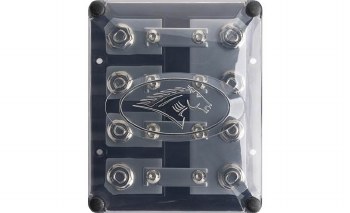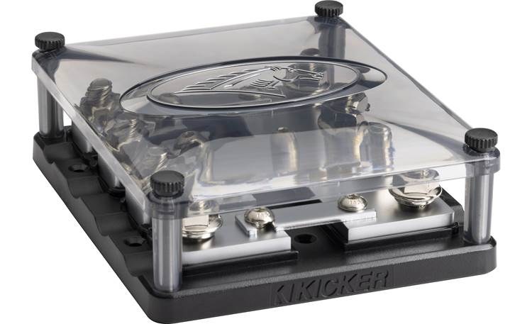 Overview: The Kicker Warhorse HPFD4 is a heavy-duty, dual power or ground distribution block that uses 5/16" threaded studs for connection points, letting you use ring terminals for your wire connections. The HPFD4 features nickel-plated brass connection points housed in an injection-molded base. A removable translucent cover helps protect the terminals while open sides provide ample room for cables.